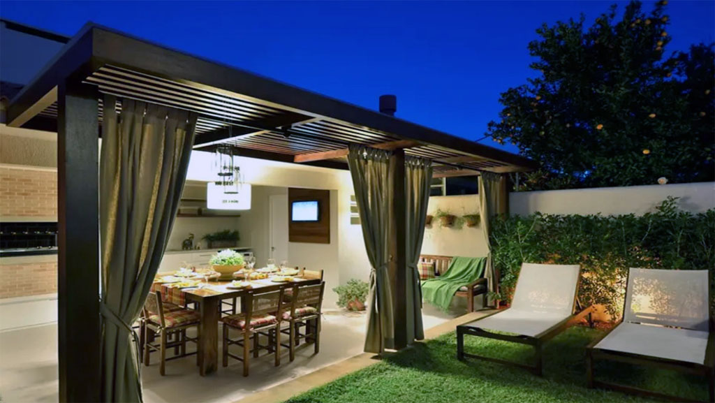 - Il est fait avec de l’aluminium, le toit fait avec des lamelles fixes d’aluminium. Une face est munie de deux rideaux.